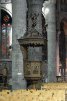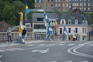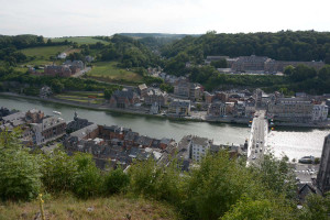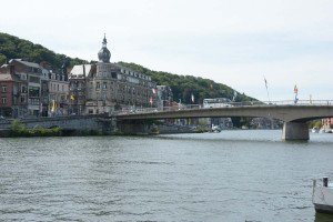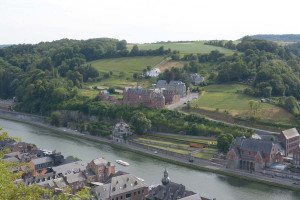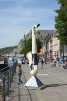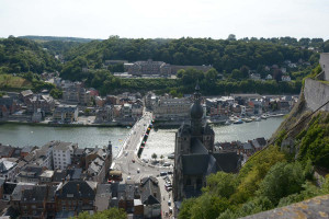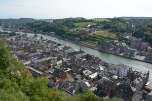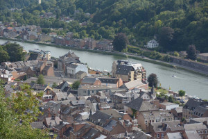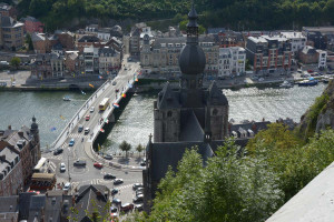 Dinant is a Walloon city and municipality located on the River Meuse, in the Belgian province of Namur. Dinant is positioned in the Upper Meuse valley, at a point where the river cuts deeply into the western Condroz plateau. Sited in a steep sided valley, between the rock face and the river. The original settlement had little space in which to grow away from the river, and it therefore expanded into a long, thin town, on a north-south axis, along the river shore. The city's landmark is the Collegiate Church of Notre Dame de Dinant which has a central tower with a famous onion dome and facetted multi-staged lantern. The house of Adolphe Sax, inventor of the saxophone is located in the street of the same name.