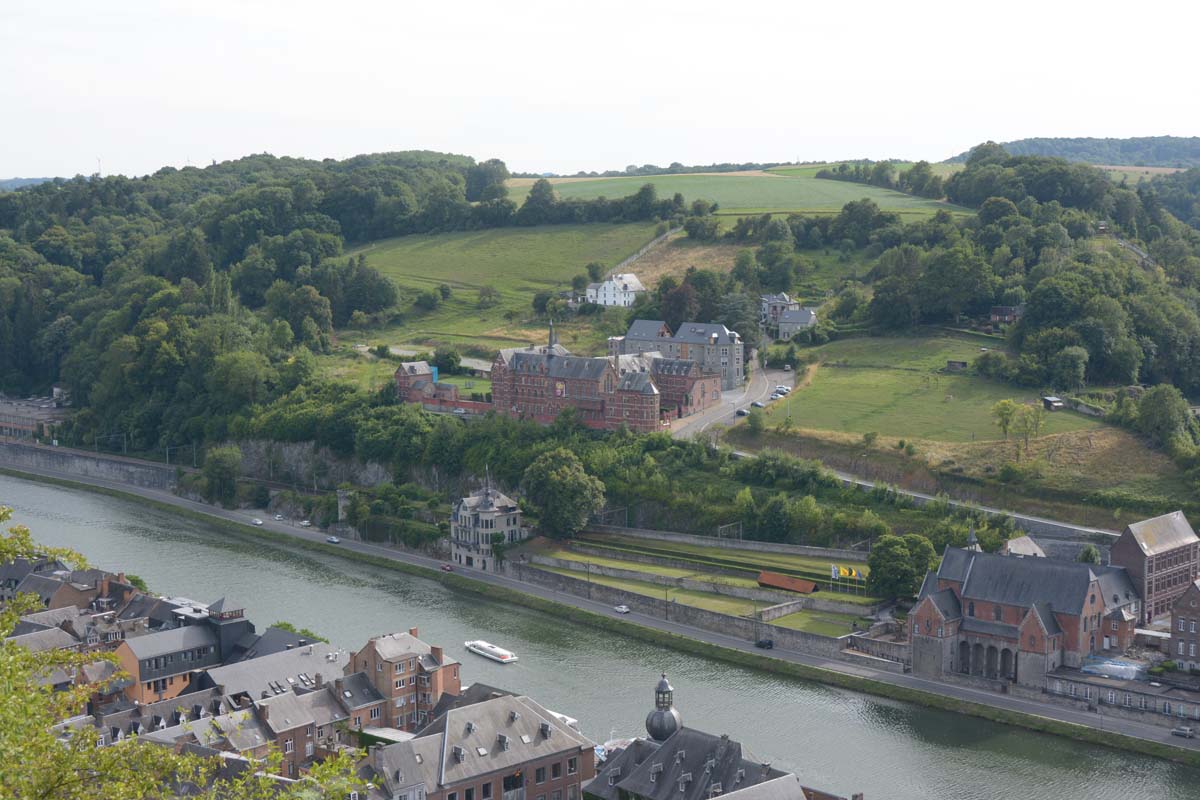 Dinant is a Walloon city and municipality located on the River Meuse, in the Belgian province of Namur. Dinant is positioned in the Upper Meuse valley, at a point where the river cuts deeply into the western Condroz plateau. Sited in a steep sided valley, between the rock face and the river. The original settlement had little space in which to grow away from the river, and it therefore expanded into a long, thin town, on a north-south axis, along the river shore. The city's landmark is the Collegiate Church of Notre Dame de Dinant which has a central tower with a famous onion dome and facetted multi-staged lantern. The house of Adolphe Sax, inventor of the saxophone is located in the street of the same name.