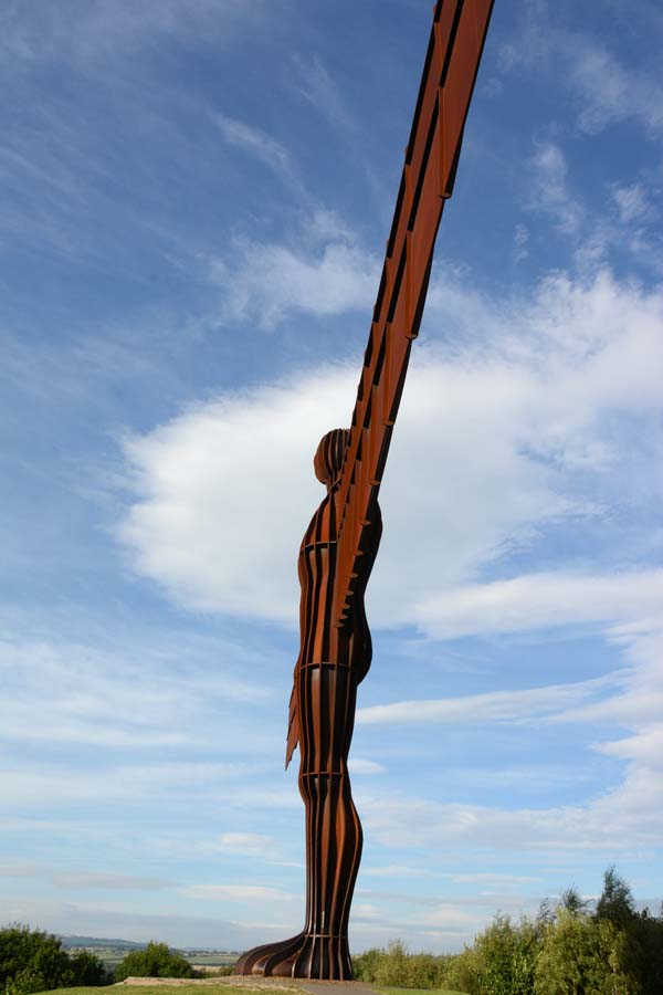The Angel of the North is a contemporary sculpture, designed by Antony Gormley, located in Gateshead, Tyne and Wear, England. Completed in 1998, it is a steel sculpture of an angel, 20 metres (66 ft) tall, with wings measuring 54 metres (177 ft) across. The wings do not stand straight sideways, but are angled 3.5 degrees forward to create "a sense of embrace". It stands on the hill of Birtley, at Low Eighton in Lamesley, overlooking the A1.